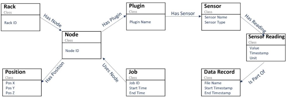 The team’s first innovation was developing a domain-specific ontology for operational data analytics telemetry [2]. Unlike existing data center ontologies that focus primarily on inventory cataloging and infrastructure documentation, this ontology captures the critical relationships between topological components, hardware systems, and job execution data. The representation mirrors how domain experts actually conceptualize HPC operations: racks contain compute nodes positioned in three-dimensional space, plugins organize sensors that produce timestamped readings, and submitted jobs connect directly to the computational resources they utilize. Figure 2 shows the developed ODA ontology.