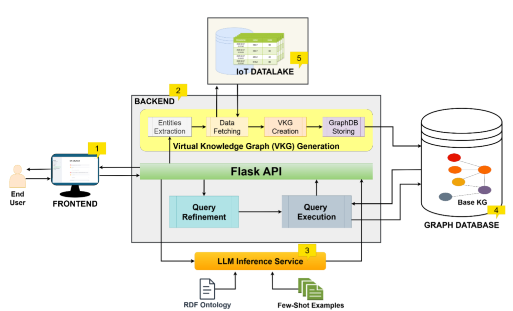 Figure 3 shows the proposed end-to-end architecture for the Data Analytics (DA) chatbot for data centers and HPC [3]. The architecture contains five components: (1) Frontend, built using streamlit library, that provides a chatbot interface to the user, (2) Backend, that is built using FlaskAPI, once it receives a user question, two concurrent processes of SPARQL generation and Virtual Knowledge Graph (VKG) generation is started. SPARQL is generated using the (3) LLM inference service, that takes as input the user input prompt in natural language along with the ODA ontology, to guide the LLM about the logical data model, and a set of few-shot examples as context. Meanwhile, the second concurrent task of VKG takes the user prompt, and using natural language processing tools, such as pattern matching and rule-based critertias to extract the necessary entities from the user text that guides the system of which parameters and sensor data to fetch from the (5) IoT datalake component of the system. Once these entities are extracted, using templated query codes, specific to the IoT datalake, the system fetches the data and then maps it according to the ODA ontology to create the virtual knowledge graph and then this graph is stored inside the (4) Graph database. Inside the graph database, their is already a Base-KG that contains the system’s topological and spatial metadata and combining these with the incoming virtual knowledge graph, the system now has the required data to get the answer to the initial natural language user question. Finally, the generated SPARQL query is executed on the SPARQL endpoint of the (4) Graph Database, and the corresponding answer is then returned back to the user on the (1) Frontend, as a table, or in case of a large table with more than 50 rows, as a CSV downloadable link.
