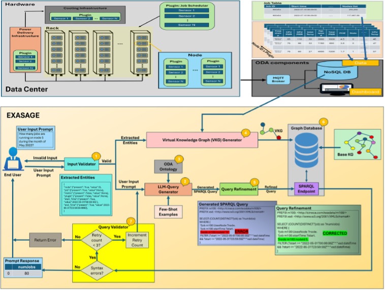 The culmination of this research trajectory is EXASAGE—the first operational data analysis assistant for HPC systems [4]. The figure 4 shows the architecture diagram of EXASAGE framework. EXASAGE combines the structured power of knowledge graphs with large language models to create a natural language interface for telemetry data, enabling operators to ask questions in ordinary language and receive accurate, contextually appropriate responses.