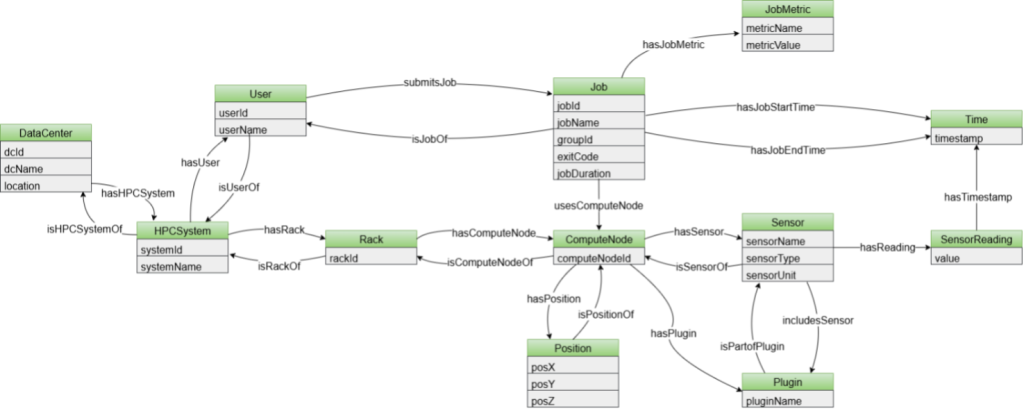This unification required addressing fundamental differences in how facilities conceptualize and record operational data. While the Marconi100 telemetry follows a sensor-centric model where time-series readings attach to physical monitoring devices, Fugaku’s F-DATA dataset is fundamentally job-centric—recording performance metrics per job rather than per sensor. The unified ontology accommodates both paradigms through new classes that capture data center and HPC system hierarchies, user-specific workload patterns, and job-level metrics alongside traditional sensor readings.